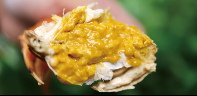 黃油相融,難分彼此。油膏浸滿整只蟹身,腹肉、蟹腿、蟹螯,甚至蟹腮,全身都金黃透光。細細品嘗,渾身散發(fā)一股霸道的鮮甜,是普通青蟹的10余倍,簡直就是“人間尤物”。